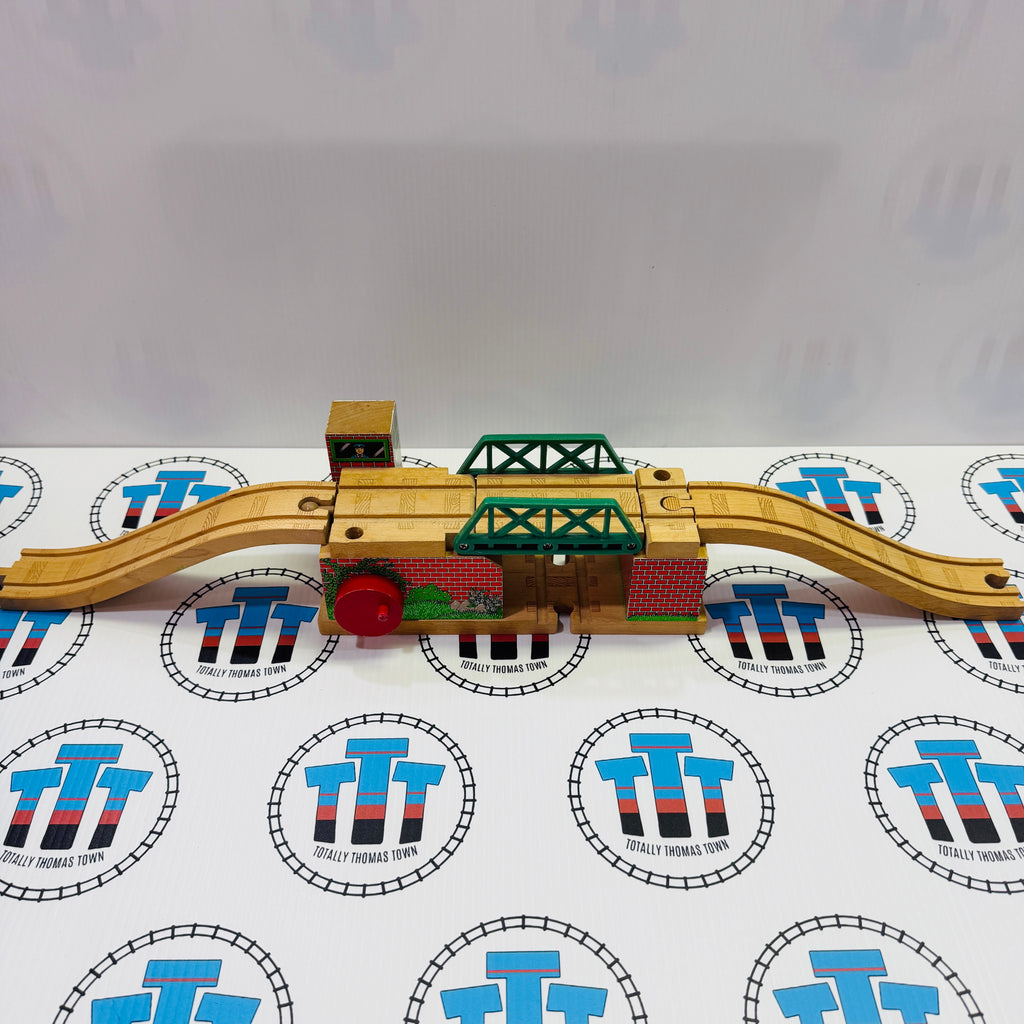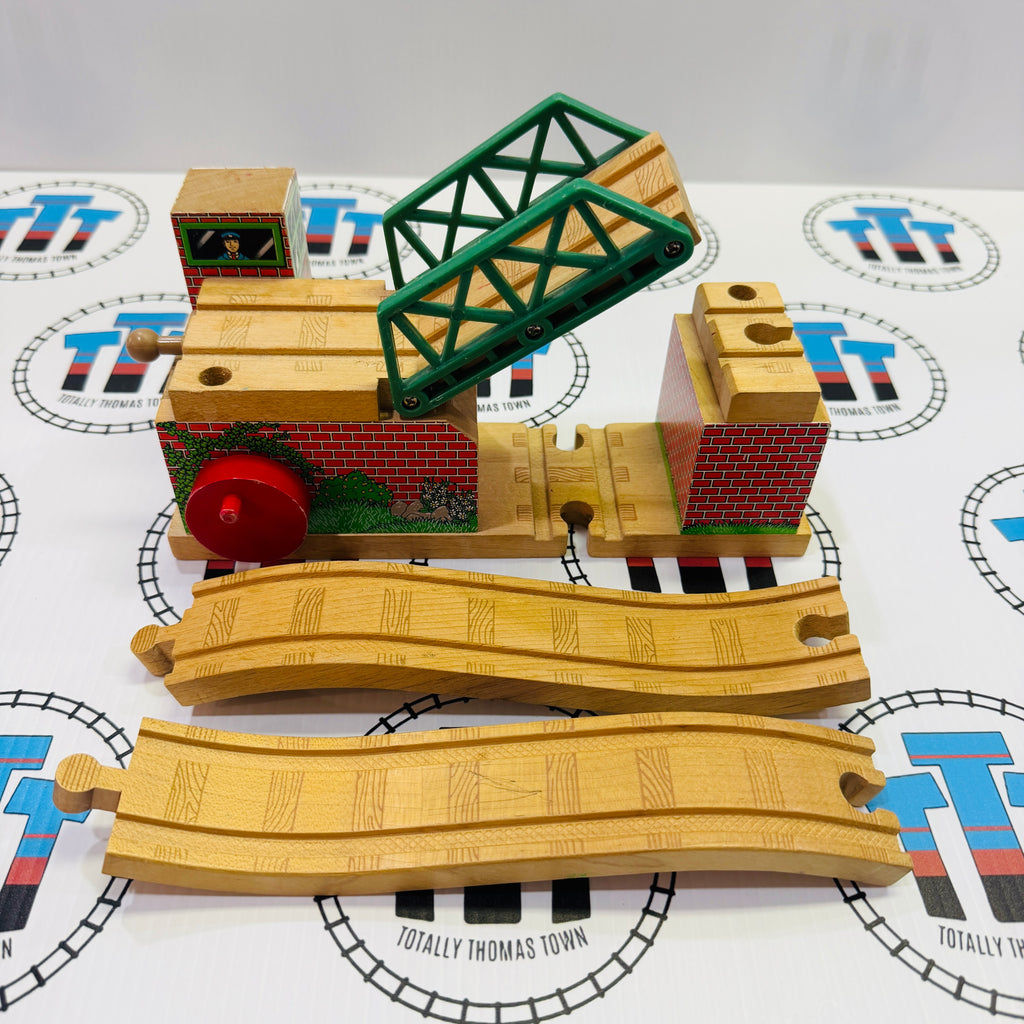 Thomas brand used lifting bridge for the wooden railway. Lifted section does not stay up