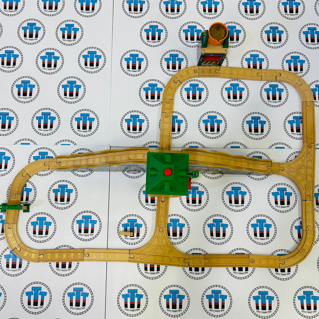 Thomas brand set with working electronics as shown, ironworks has fuzzy sound. Signal piece broken as pictured, bell is replaced with generic brand piece. One 4” straight track is not golden. SAM NOT INCLUDED